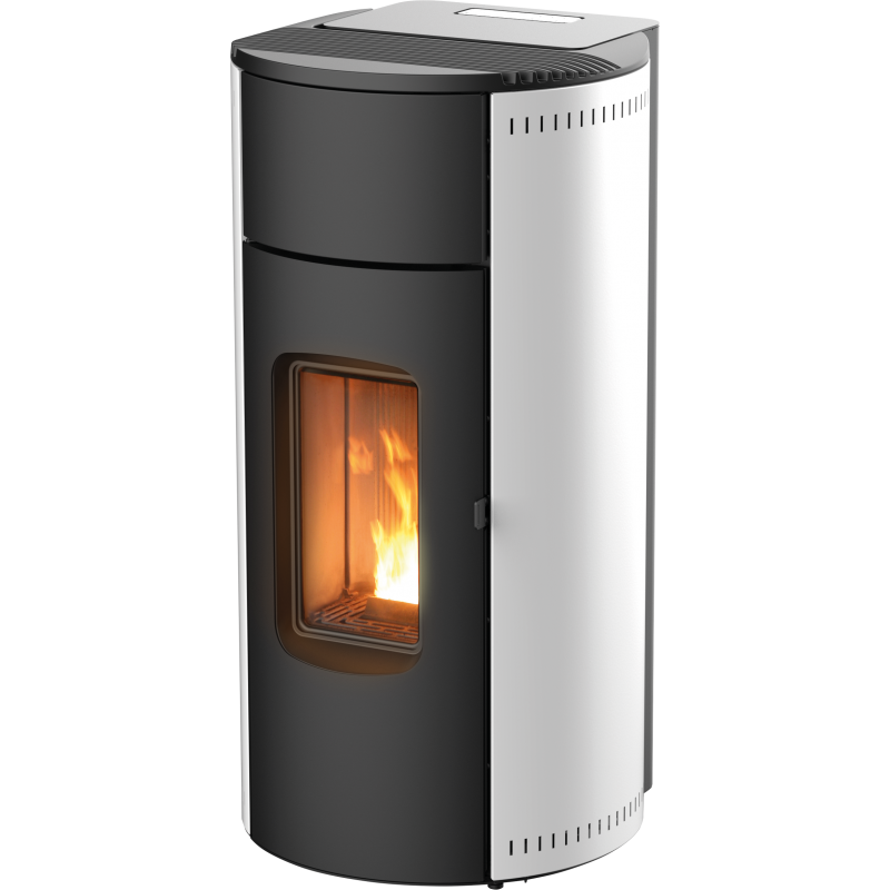 Sobă rotundă etanșă pe peleți, cu un design esențial, realizată cu partea superioară din fontă conică pe laterale și placare din oțel alb, argintiu și închis. Brazier din fontă. Aprindere rapidă. Ieșire coaxială superioară (8/13 cm) sau spate.