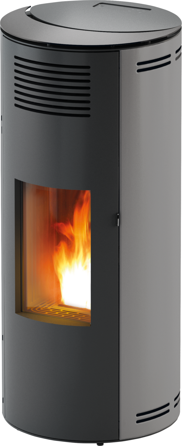 Sobă rotundă pe peleți etanșă, cu structură din oțel; blatul și lateralele din oțel alb, argintiu, închis la culoare și vișiniu. Focar mare și adânc pentru o vizibilitate mai bună a flăcării. Brazier din fontă. Aprindere rapidă.