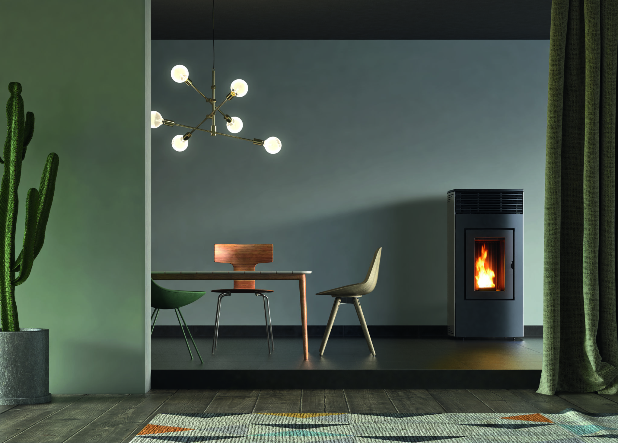 Sobă pe peleți etanșă cu blat și ușă din fontă, placare din oțel alb, argintiu sau închis la culoare. Brazier și panou posterior al focarului din fontă. Aprindere rapidă. Ieșire coaxială superioară (8/13 cm) sau spate. Puteți alege să gestionați soba prin intermediul panoului de control încorporat sau al smartphone-ului, datorită kitului Wi-Fi Easy Connect inclus.