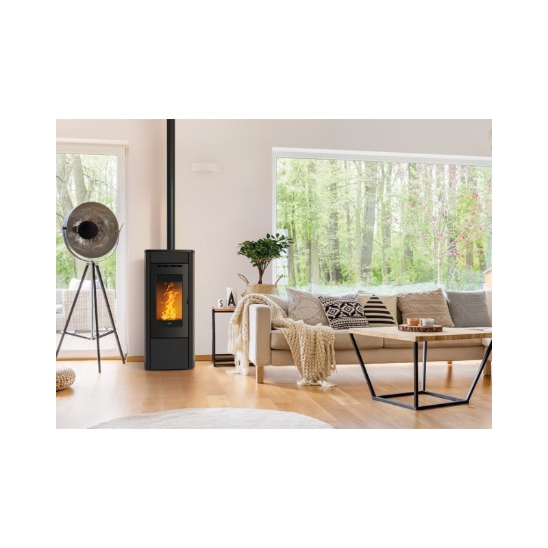 Soba pe peleti cu fata si blat din fonta. Lambriuri cu formă specială. Top cu predispoziție superioară de ieșire. Senzori de siguranță pe ușă și rezervor. Arzator cu autocuratare. WiFi ca standard