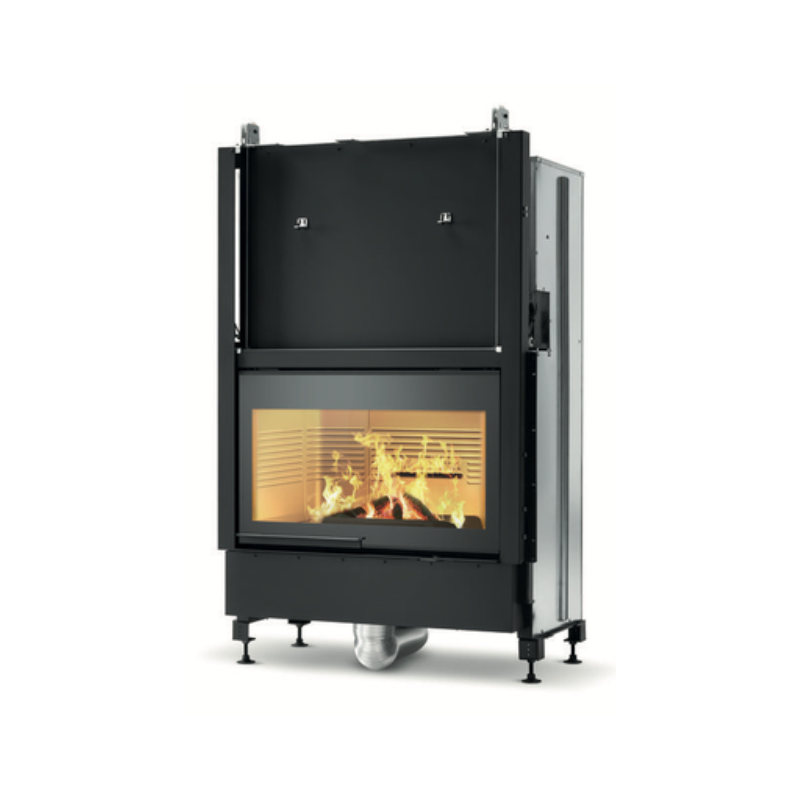 Șemineu pe lemne cu ușă glisantă și focar Thermofix. Caracterizat prin performanțe ridicate și emisii foarte scăzute.