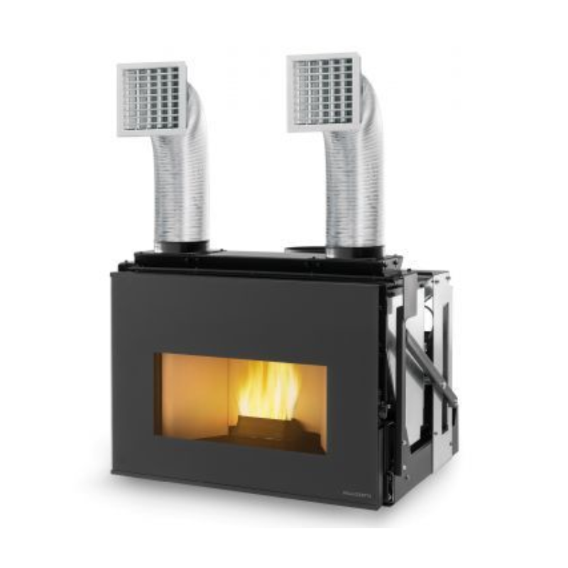 • canalizare aer cald gestionată simultan de două ventilatoare centrifuge și echipată cu două ieșiri de Ø14 cm (țevi și guri de aerisire incluse)
