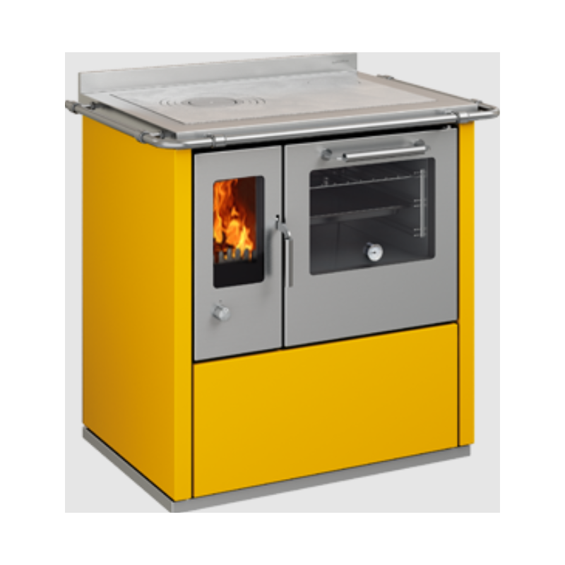Sobă pe lemne cu cuptor DE MANINCOR E80, dimensiuni 80x60x86 cm, culoare galben cu usi din inox